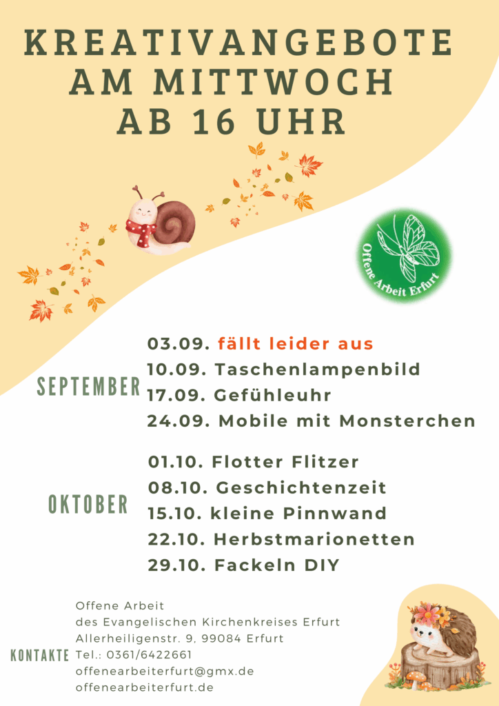 Hier kommt es, das Kreativprogramm für Kids im September und Oktober 🙂 Jede Woche mittwochs um 16 Uhr während des Familiencafés (15-18 Uhr) Kommt vorbei und macht mit!