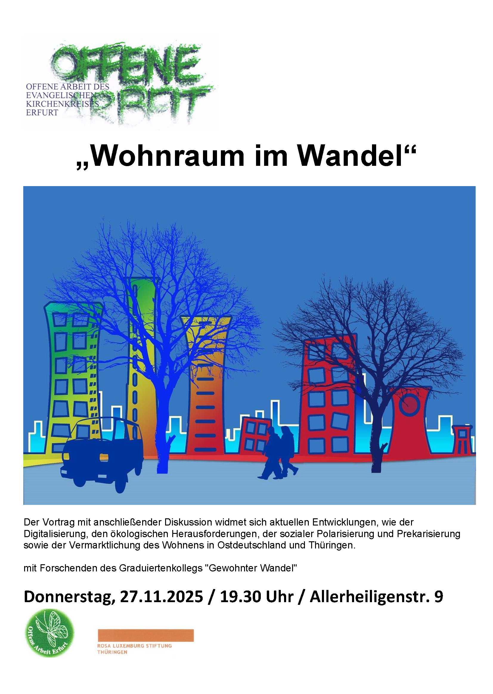 „Wohnraum im Wandel“ / 27.11.2025 / 19.30 Uhr / Allerheiligenstr. 9 / in Kooperation mit der Rosa Luxemburg Stiftung Thüringen